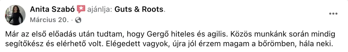 Újra jól érzem magam a bőrömben! Már az első előadás után tudtam, hogy Gergő hiteles és agilis. Közös munkánk során mindig segítőkész és elérhető volt. Elégedett vagyok, újra jól érzem magam a bőrömben, hála neki.