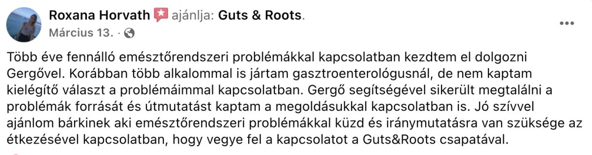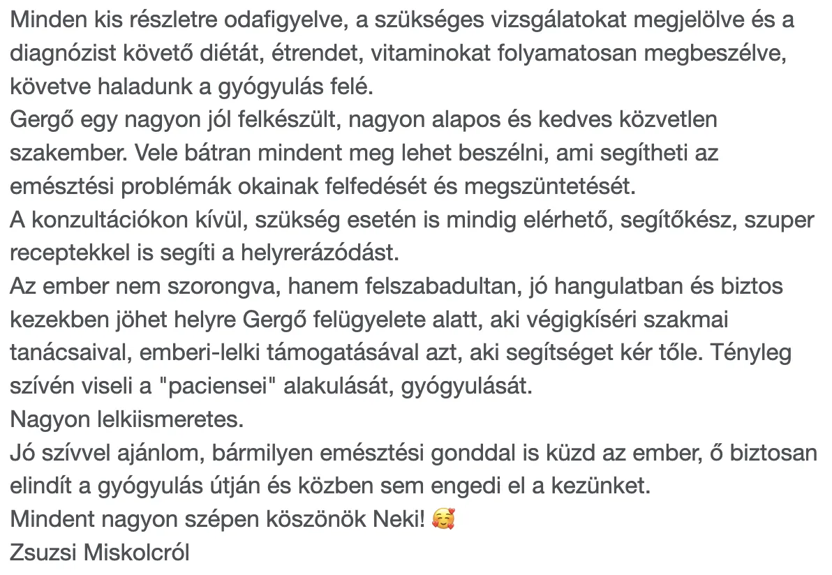 Sehol sem tudták megállapítani, hogy mi a problémám, és milyen irányba kell elindulnom a megoldás keresésében. Gergő ebben nagyon sokat segített nekem, sok olyan információt osztott meg velem táplálkozási és emésztőrendszeri oldalról is, amikről korábban még egyik orvostól sem hallottam semmit, valamint szakember ajánlással is hozzájárult a kezelésemhez.