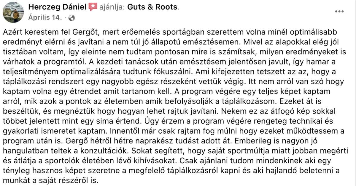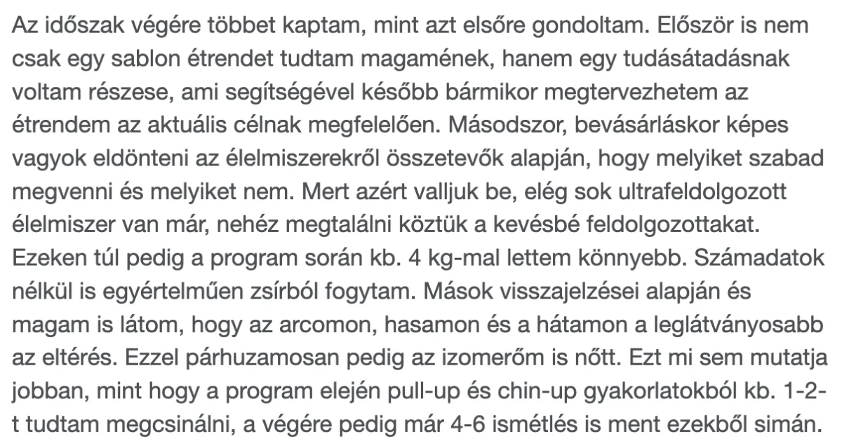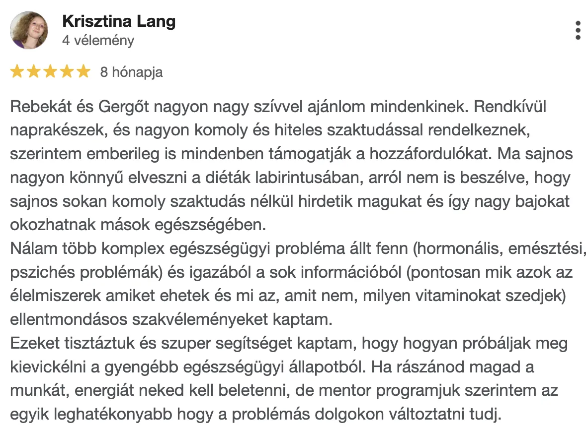 ...közösen sikerült. Szerettem volna segítséget kapni arra a kihívásra, hogy kikerüljek az ördögi körből, amit magamnak okoztam: hogyan tudom a kor előrehaladtával, rendszeres futással/testmozgással és az étkezésre való odafigyeléssel kiváltani a „nagy népszerűségnek örvendő prémium kategóriás poros diétát”, amelyet már több, mint 5 éve folytattam. Nagyon sok információt, könnyen elkészthető recept ötletet kaptam Gergőtől. Tetszett az az alázat, és a választott szakterülete iránti elhivatottság, valamint az a rengeteg tudás, amit felhalmozott annak érdekében, hogy segíteni tudja ügyfeleit azok rögös útja során, ahol voltak nagy menetelések, visszaesések és újabb nekiveselkedések. De, közösen sikerült. A fentieken kívül az tetszett a legjobban, ahogy a konzultációk során érdeklődő és őszinte figyelemmel kísérés esete valósult meg, valamint az, hogy tényleg megnézte a táblázatokat / összeállított anyagokat, amelyeket küldtem, és felkészült minden egyes konzultációra. Az már csak a hab a tortán, hogy kolléganőjével, ha olyan kérdésre került sor, amely a hölgy szakterülete volt, rövid idő alatt egyeztetett és visszajelzett. Ha tényleg változtatni szeretnél, akkor jó helyen jársz, csak javasolni tudom Őket.